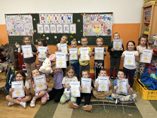 15 września Dzieci z Rocznego Przygotowania Przedszkolnego obchodziły Międzynarodowy Dzień Kropki, to święto kolorów, radości i kreatywności. Przedszkolaki malowały plakaty, ozdabiały kropki z imionami, wykonywały kolorowe kropki farbami, bawiły się w zabawy ruchowe. Zakończeniem święta było otrzymanie odznaki i dyplomu .